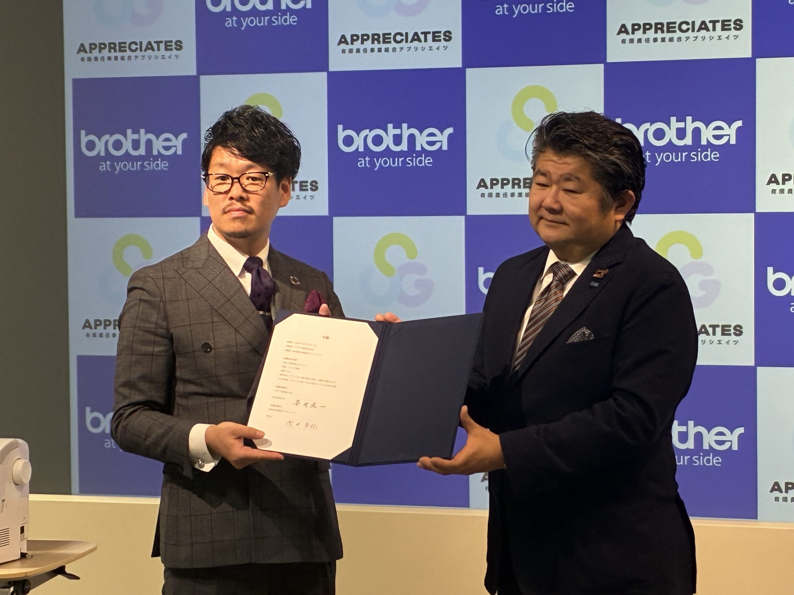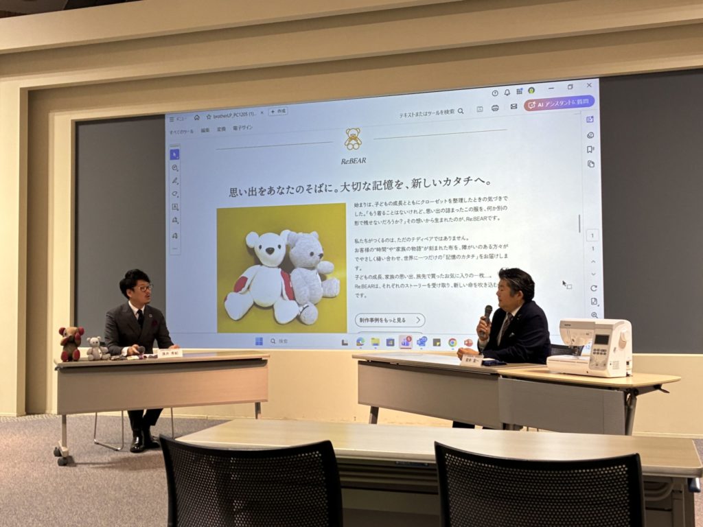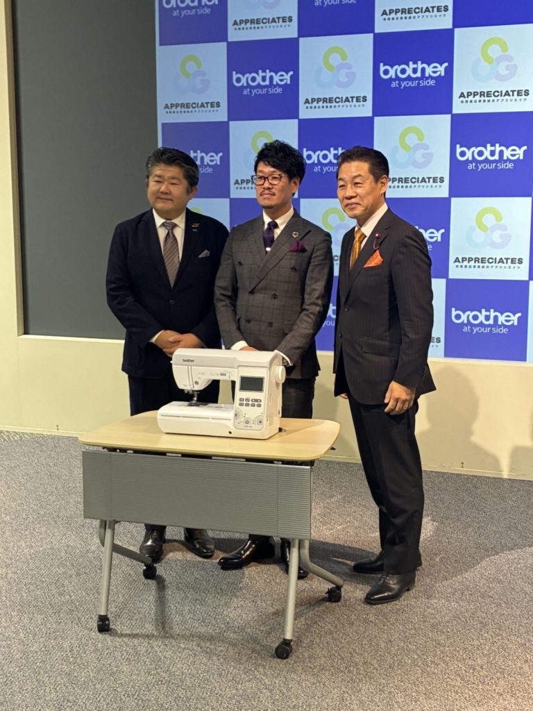 2025年12月9日、名古屋市瑞穂区にあるブラザー工業株式会社ブラザーミュージアムにて、ブラザー販売株式会社様より有限責任事業組合アプリシエイツへ家庭用ミシンをご寄贈いただく寄贈式と、「ミシンのちから」プロジェクトの発表が行われました。当日は、第100代名古屋市会議長の西川ひさし様、ブラザー販売株式会社 代表取締役社長の安井宏一様をはじめ、アプリシエイツ発起人や関係者が出席し、温かい雰囲気の中で式典が執り行われました。